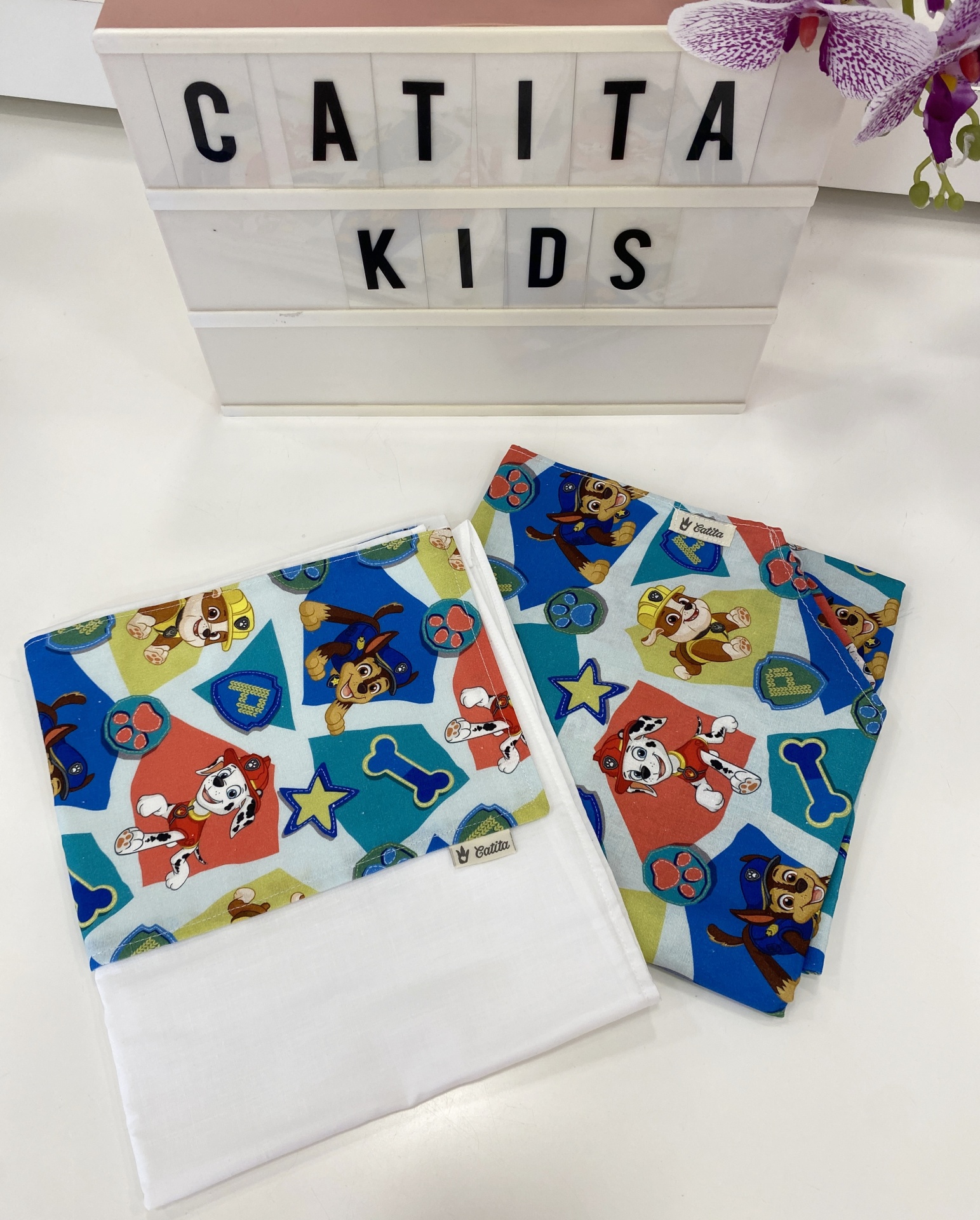 Lenço infantil com padrão Patrulha Pata com caixa luminosa CATITA KIDS ao fundo