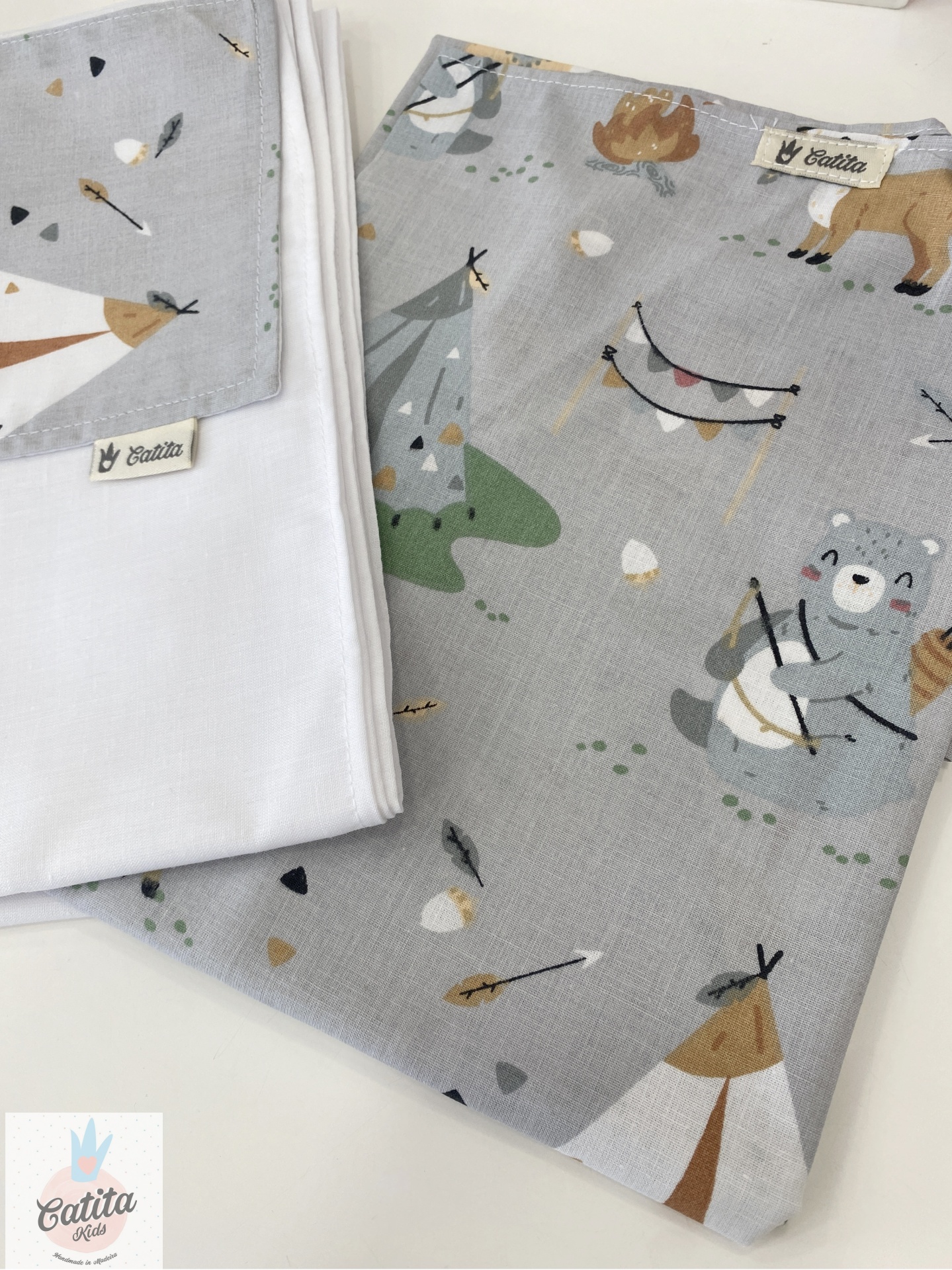 Peças têxteis infantis cinzentas e brancas com padrão de ursos e tendas