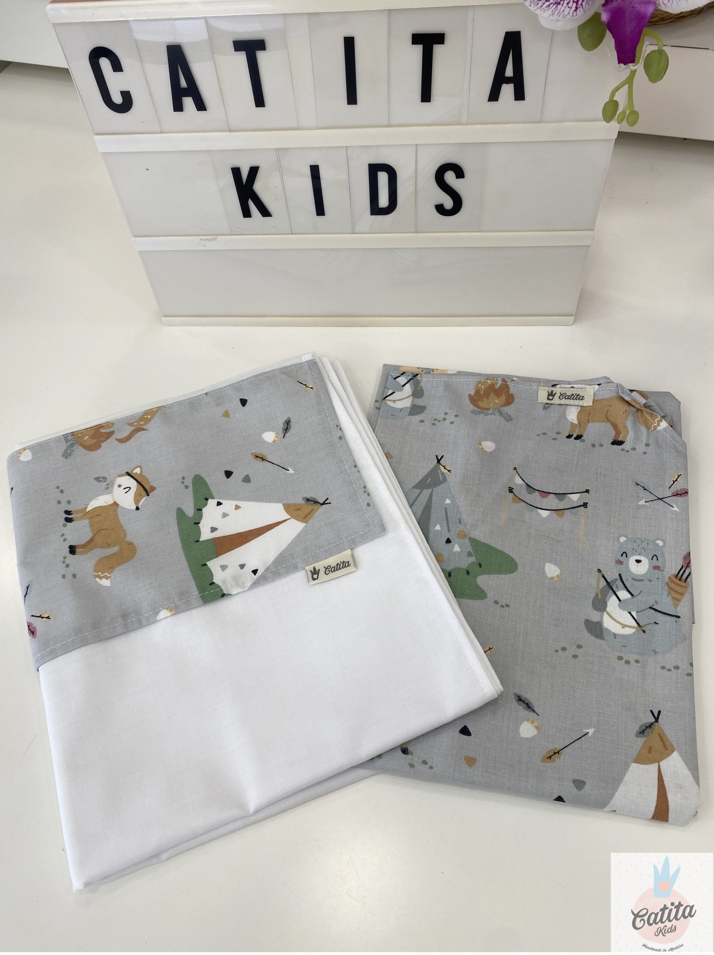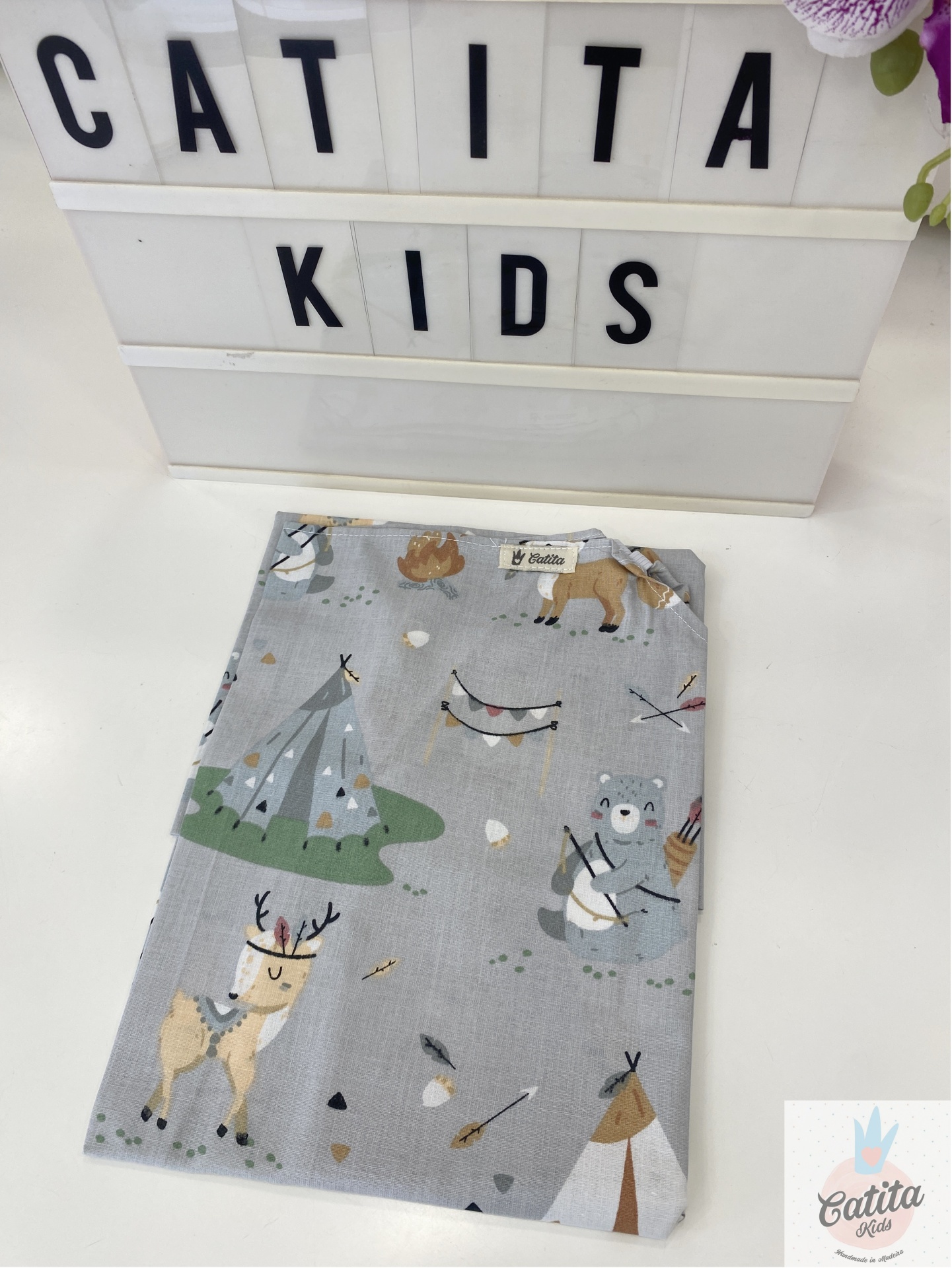 Lenço cinzento com desenhos de animais e acampamento, placa de luz com texto 'CATITA KIDS' e orquídea roxa