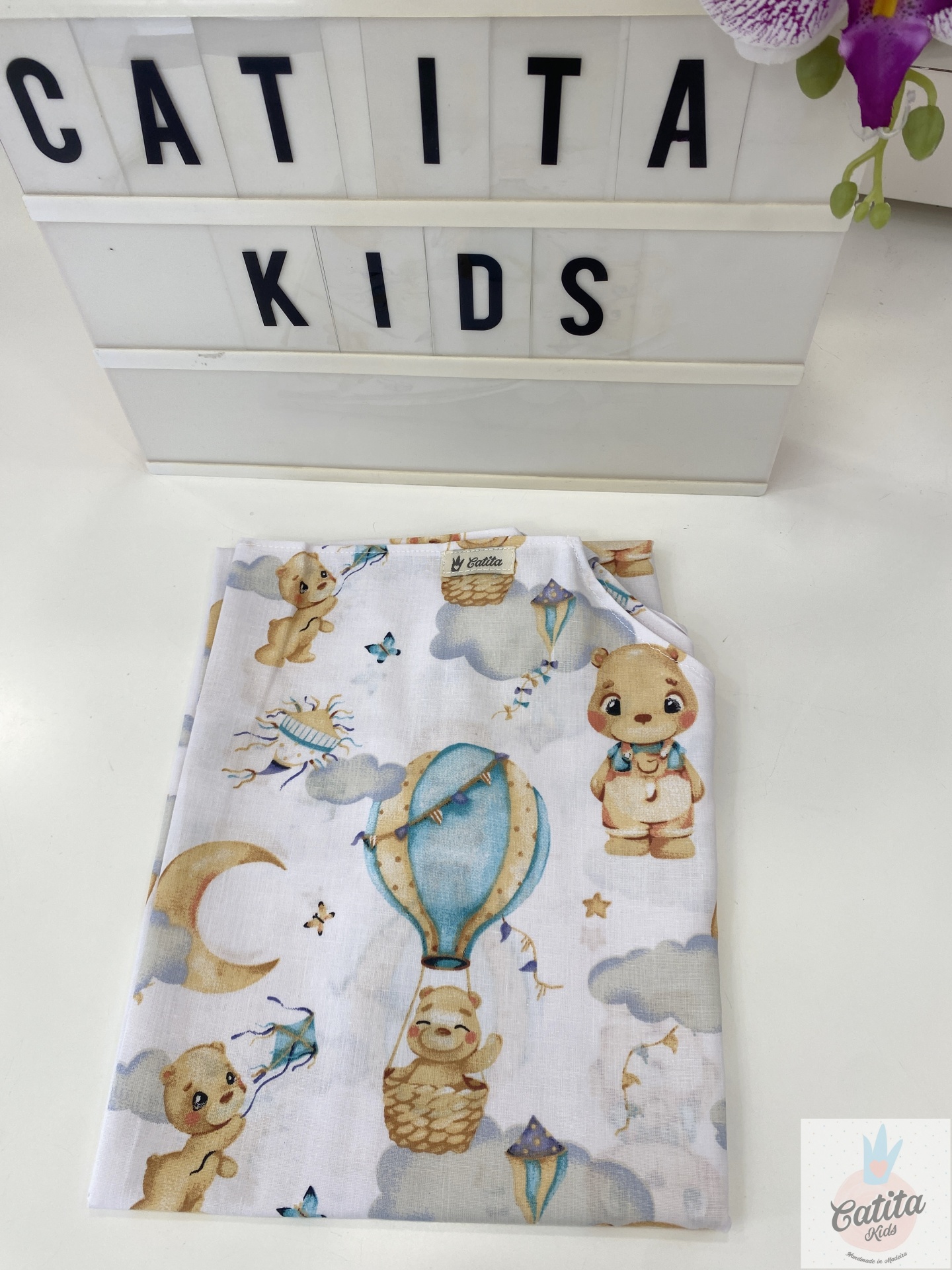 O lençol de baixo (padrão) ajusta-se facilmente ao catre pois tem o corte e as alças que se ajustam na perfeição, evitando que os lençois se movam e que os vossos filhos fiquem em contacto directo com o catre.