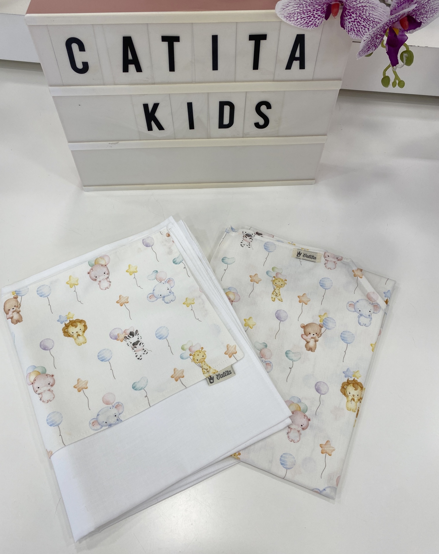 Dois panos para bebé com estampas de animais e balões e placa com texto CATITA KIDS