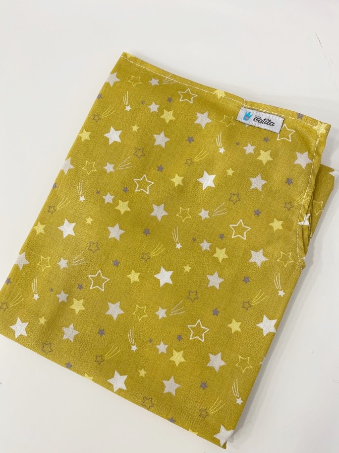 Lenço amarelo com padrão de estrelas sobre superfície branca com placa 'CATITA KIDS'