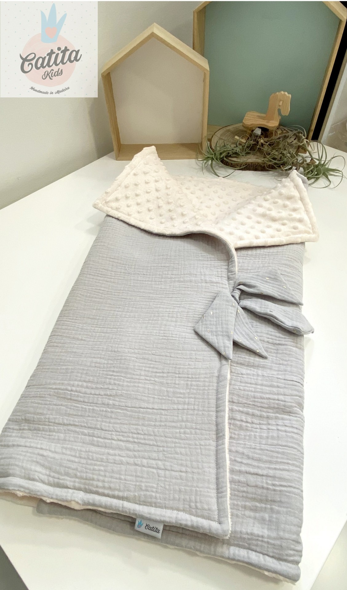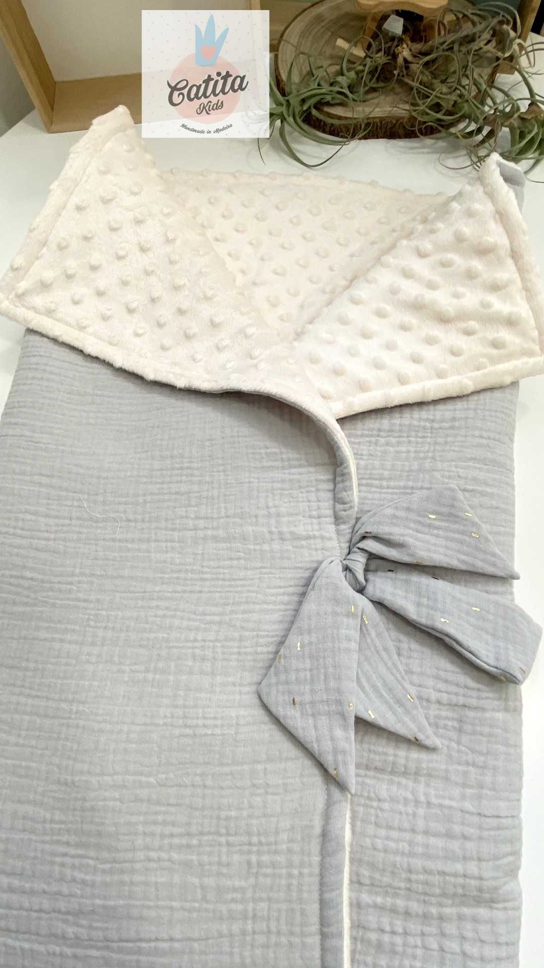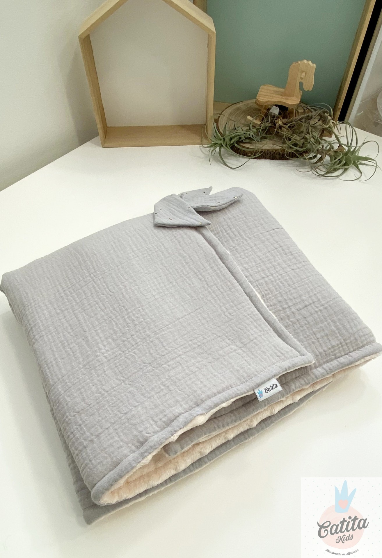 Musselina orgânica cinza de um lado, pelúcia quentinha do outro na cor pérola.