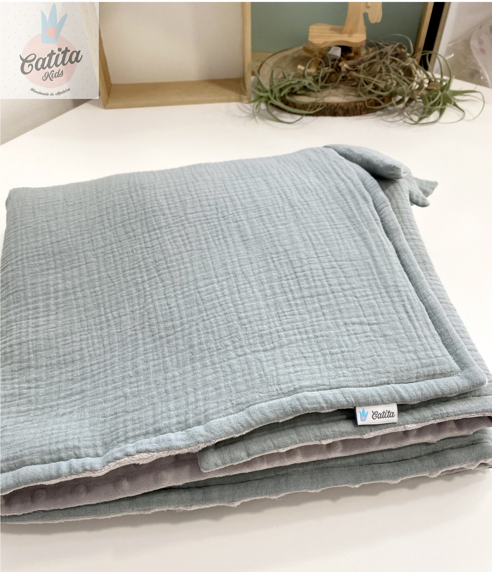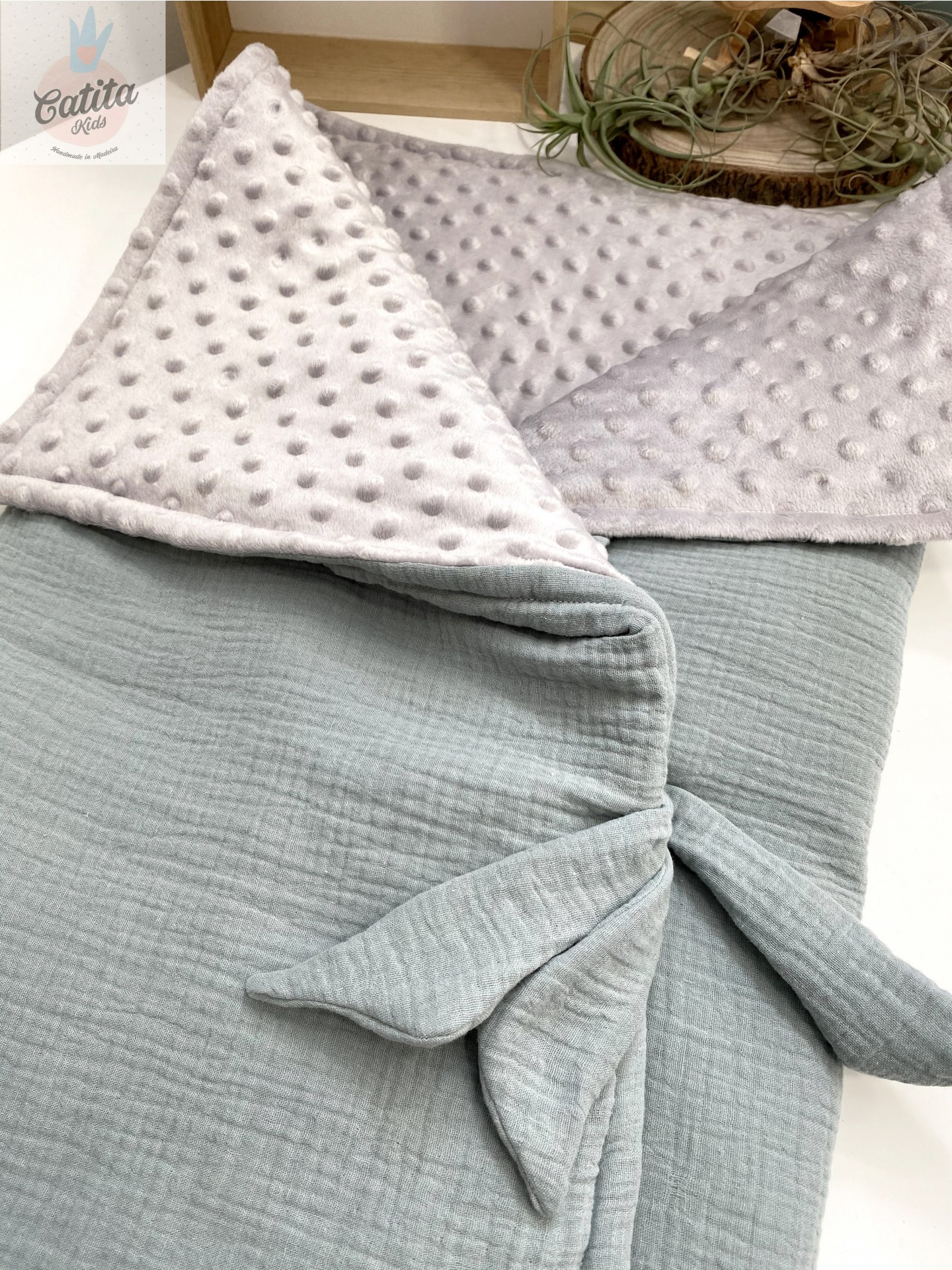 Musselina orgânica verde menta de um lado, pelúcia quentinha do outro na cor cinza.