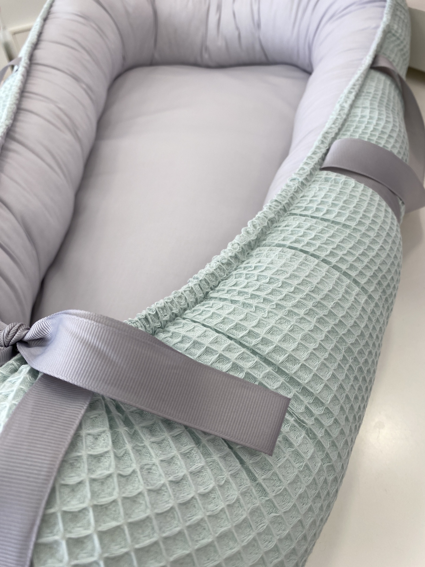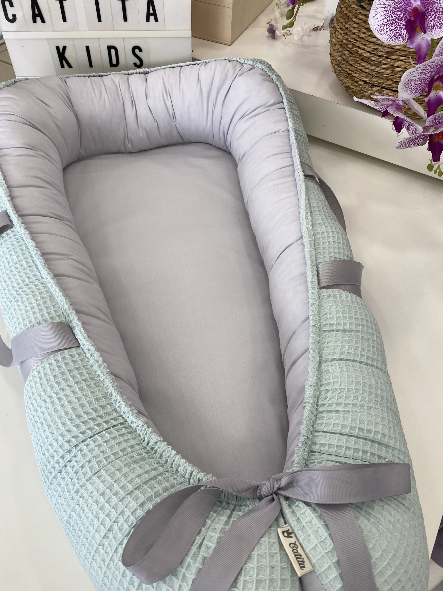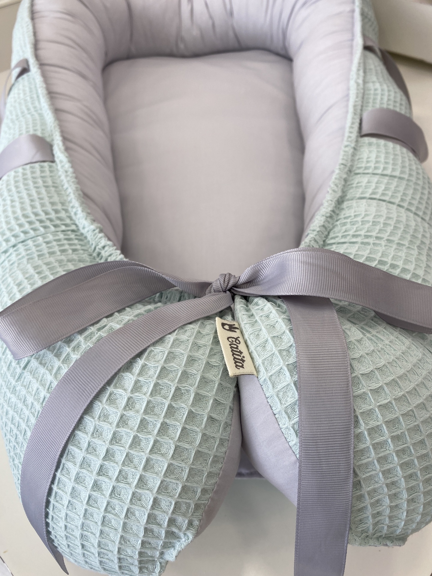 Ninho para bebé verde-água com interior cinza e fitas cinzentas.