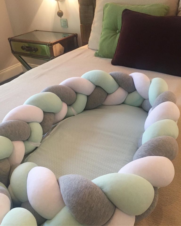 Almofada trançada de bebé colorida sobre colchão e almofadas