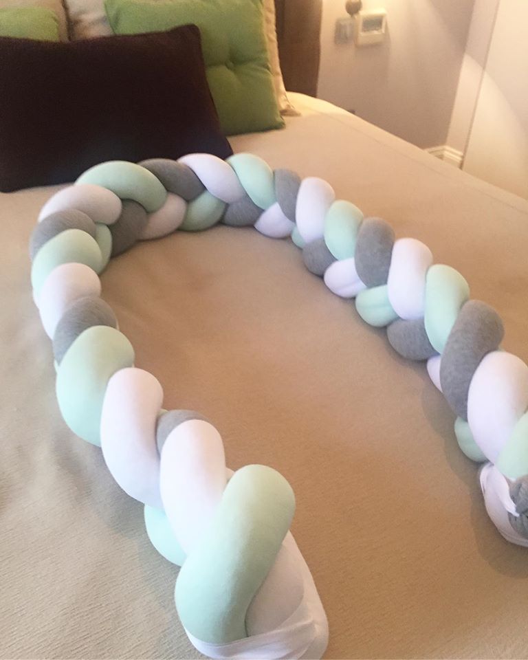 Protetores de cama trançados em tons pastéis sobre cama com almofadas verdes e marrom
